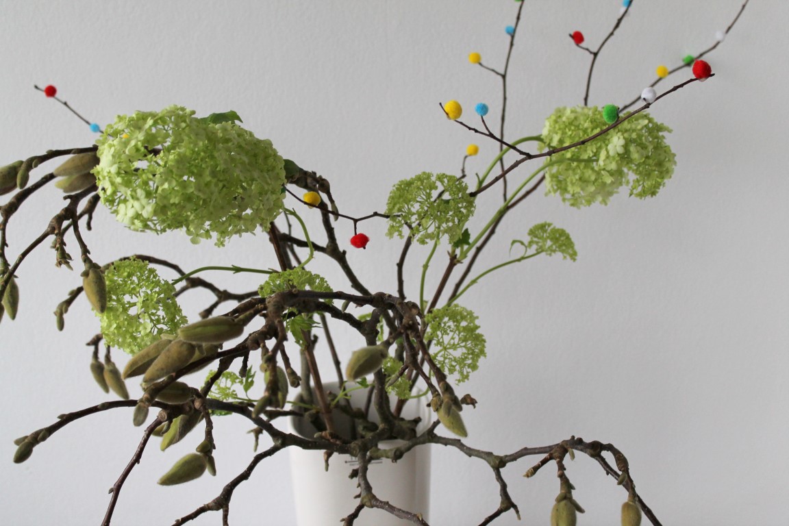 Ich liebe Magnolien und habe einfach einen Magnolienzweig zusammen mit ein paar Schneeball-Blumen zu den bunten Zweigen gestellt. So ist auch noch etwas frisch Blühendes in der großen Vase. Auf der Fensterbank konnte ich dann fast täglich den Magnolien beim Blühen zusehen. Ein richtiges Spektakel und ein Hauch von Frühling im Haus.