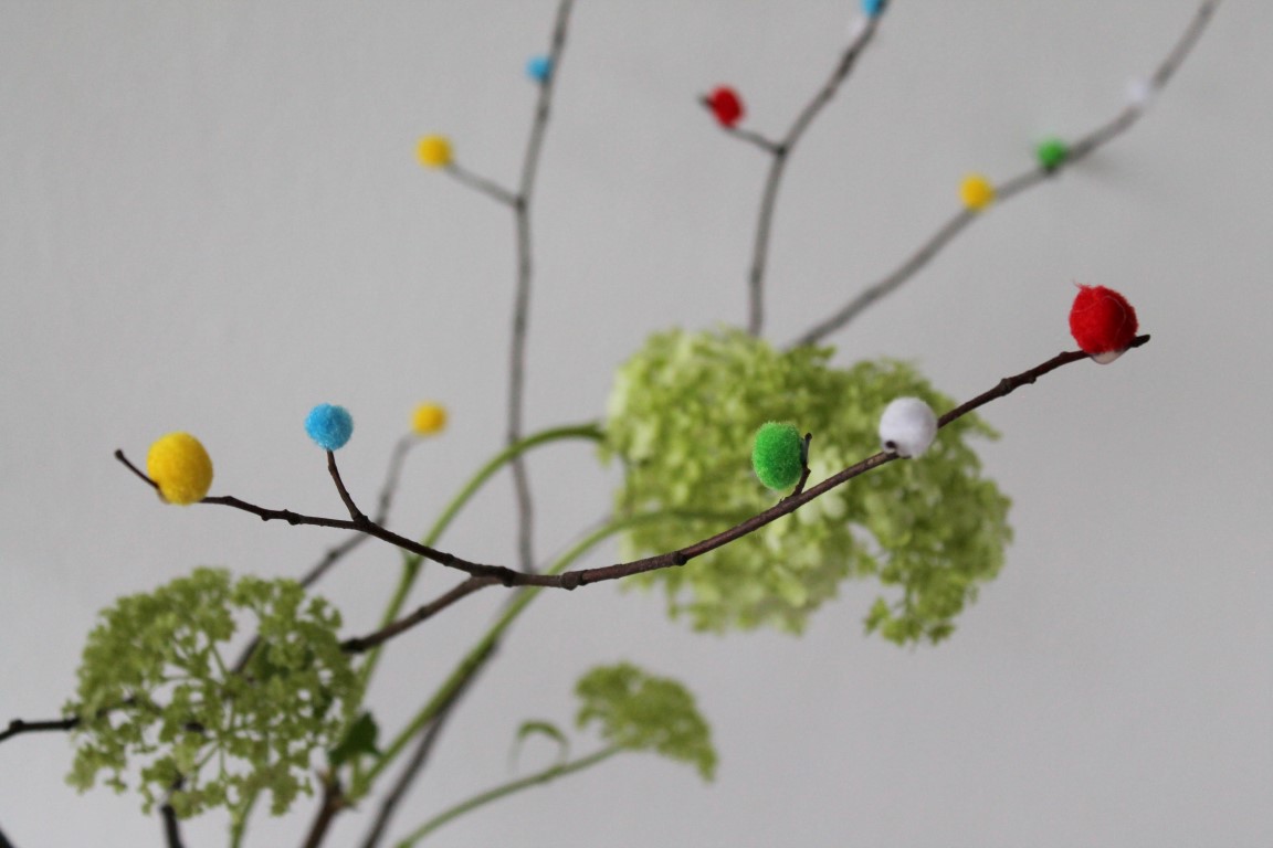 Nicht nur wegen Karneval hatte ich die DIY Pompom-Zweige schon länger auf meiner To Do List. Ich mag einfach die bunten Farben im frühlingshaften Zweigwerk. Passend zu Karneval und meiner Parthütchen-Deko habe ich noch ein paar gesammelte Zweige mit den restlichen bunten Pompoms beklebt. Dazu einfach einen Tropfen Heißkleber auf die Pompoms setzen und an die Zweige kleben.