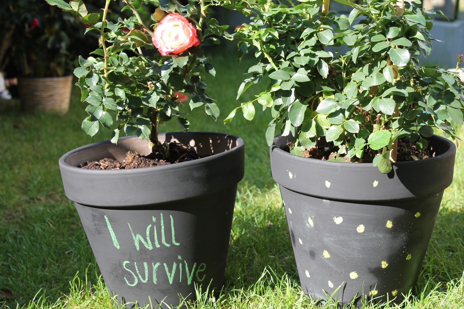 Mein neuer Freund, der Tafellack und ich, waren wieder kreativ. Die ollen brauen Blumentöpfe in der Garage haben mir schon lange nicht mehr gefallen. Und als ich sie so da stehen sah, dachte ich, in mattem schwarzen Kleid könnten sie mir vielleicht doch wieder gefallen. Also Tafellack und Pinsel gezückt und ran an die Pötte. Nach ca. 1 Stunde in der Sonne konnte der Neue schon mit Kreide kreativ werden.