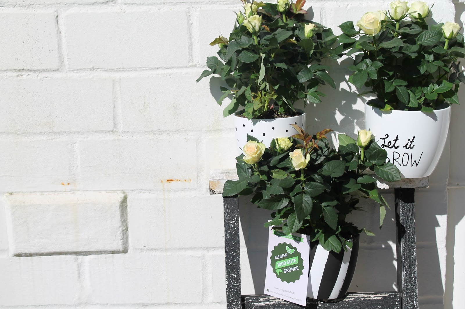 Vielleicht erinnert Ihr Euch noch an meinen Besuch auf dem Rosenhof für die Initiative 1000 gute Gründe im letzten Sommer? Meine Rosen von dort haben den Winter bestens überstanden und erfreuen sich blühender Gesundheit. Im letzten Jahr habe ich hier auf dem Blog gezeigt, wie man tolle Vasen für Schnittrosen herstellt. Heute zeige ich Euch, wie man schöne Blumenkübel für Topfrosen macht – ohne viel Aufwand. Ob als Geschenk oder für die eigene Fensterbank oder Garten. So eine Rose im hübschen Übertopf macht doch gleich was her. Wie Ihr wisst, bin ich ein großer Upcycling-Fan. Und so habe ich einfach drei weiße Übertöpfe aus dem Winterschlaf in meinem Keller befreit und die ersten Sonnentage im Garten für mein heutiges DIY genutzt. Los geht`s!